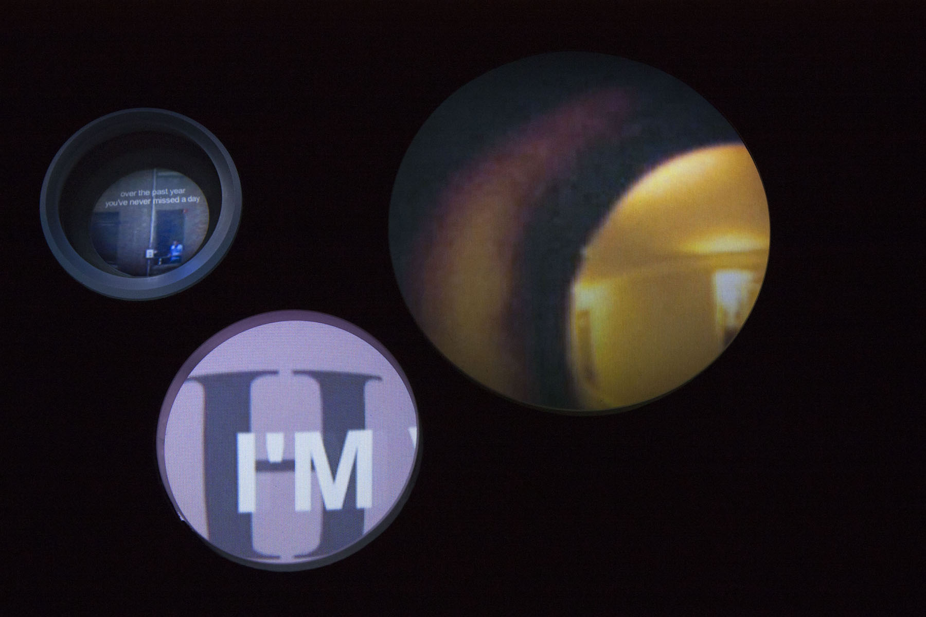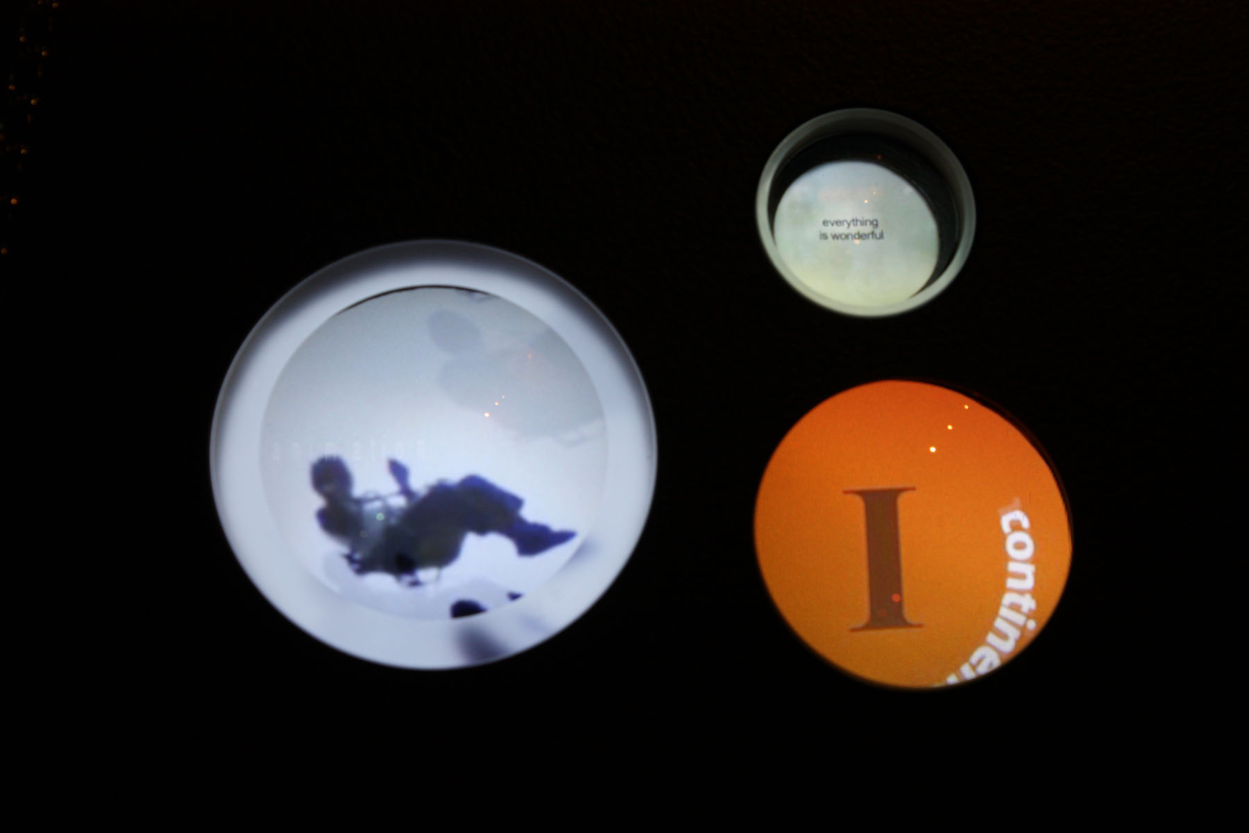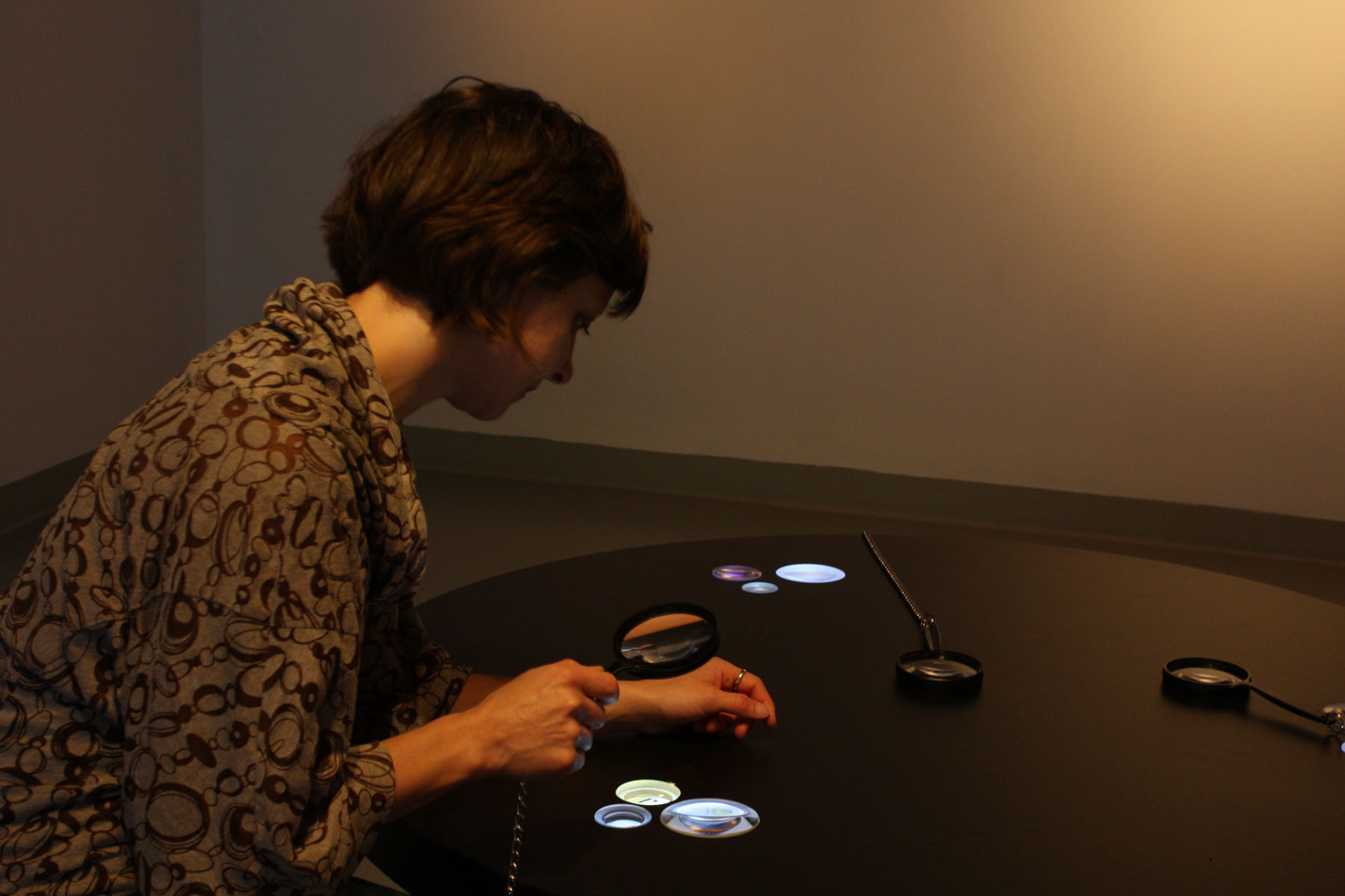 Interaction takes a different and innovative shape in Tabletop Viewables. As in Movie of the Week, private and personal reflections appear in circular form. Yet unlike touchscreen, desktop or mobile viewings, Onodera shapes the conditions of encounter with an apparatus of her own design–embedding tiny video loops into a round tabletop, magnifying or distorting each vision with its own custom lens. While reminiscent of the Petri dish videos of human-bacteria found in Israeli artist Michal Rovner’s Culture Plates, instead of a standing laboratory workbench, Onodera offers us seats at a low but elegantly designed table.