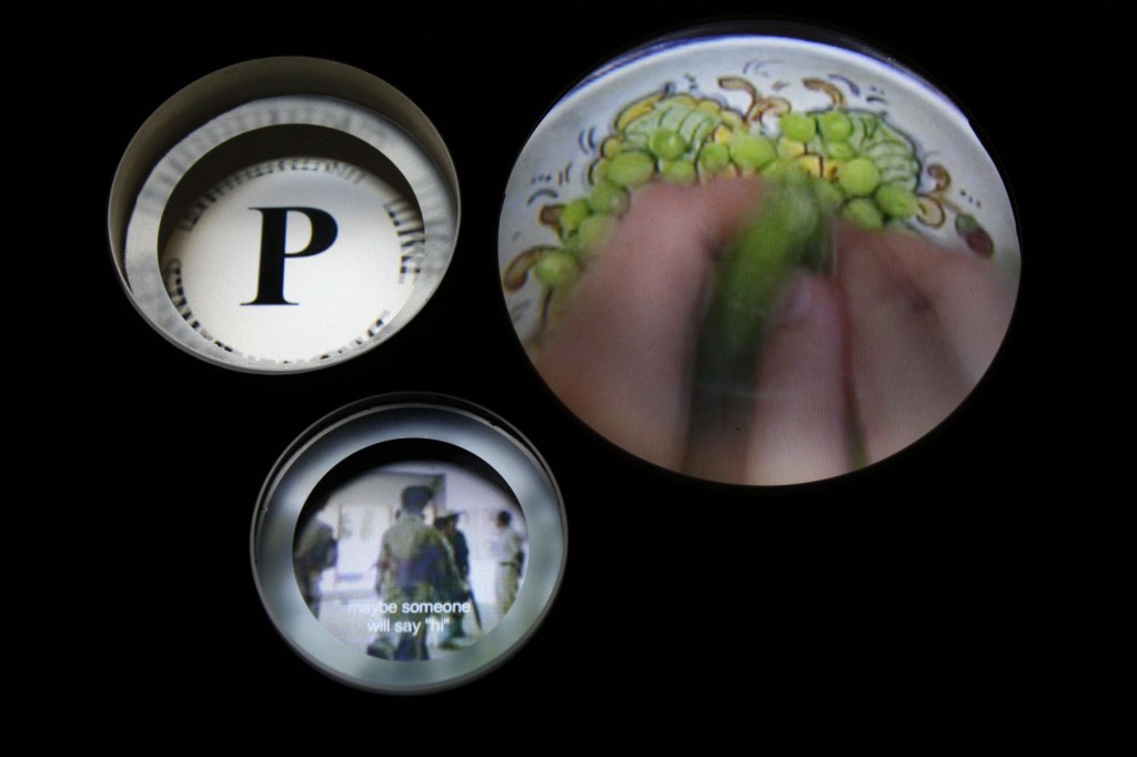 Like guests at a child’s tea party, we can scoot from seat to seat discovering three tiny three-piece place-settings of sequences featuring letterforms that spell the voiceless “Phi” (Φ)– symbol of the golden ratio and the visual phenomenon that permits us to see movement from sequences of still imagery. Each letterset of videos–P, H, and I–offers a silent narrative of memory, isolation and “submerged lives” that speaks through moving texts and imagery. P is for the peas that come in all types, being shelled by hands that seem to work just below the surface of the table beside miniature portals evoking childhood anxieties of difference, displacement and possibly guilt. H is for a habitation or hermitage expressed in the longing surveillance of the routine cigarette breaks of an office worker across the way, and the partial and perhaps paranoid peephole view of an empty and anonymous hallway. I is for the interiorization of “the things that drive me mad,” a meditation on the suppression and suspension, of thoughts and feelings, required to make it through the day.