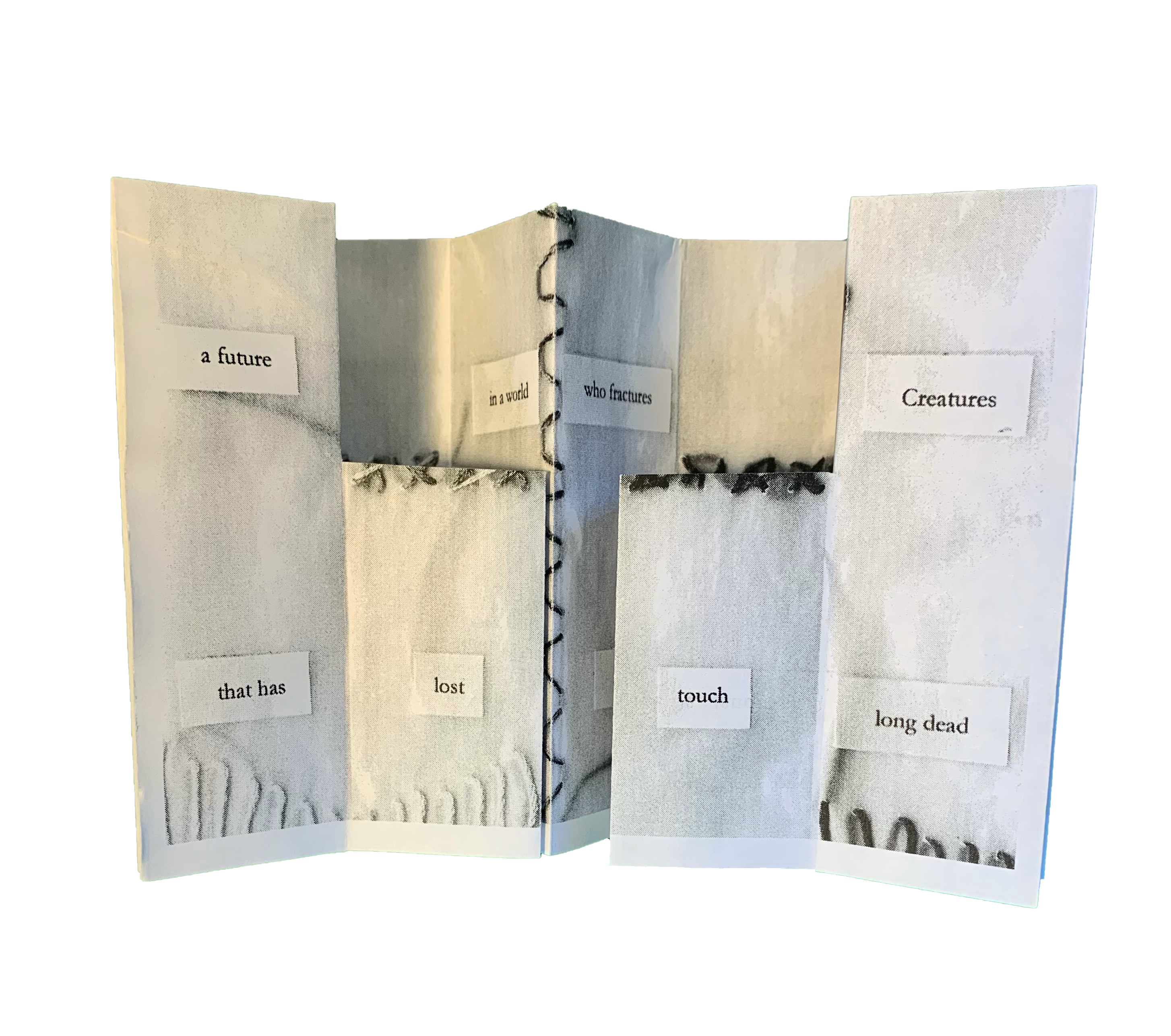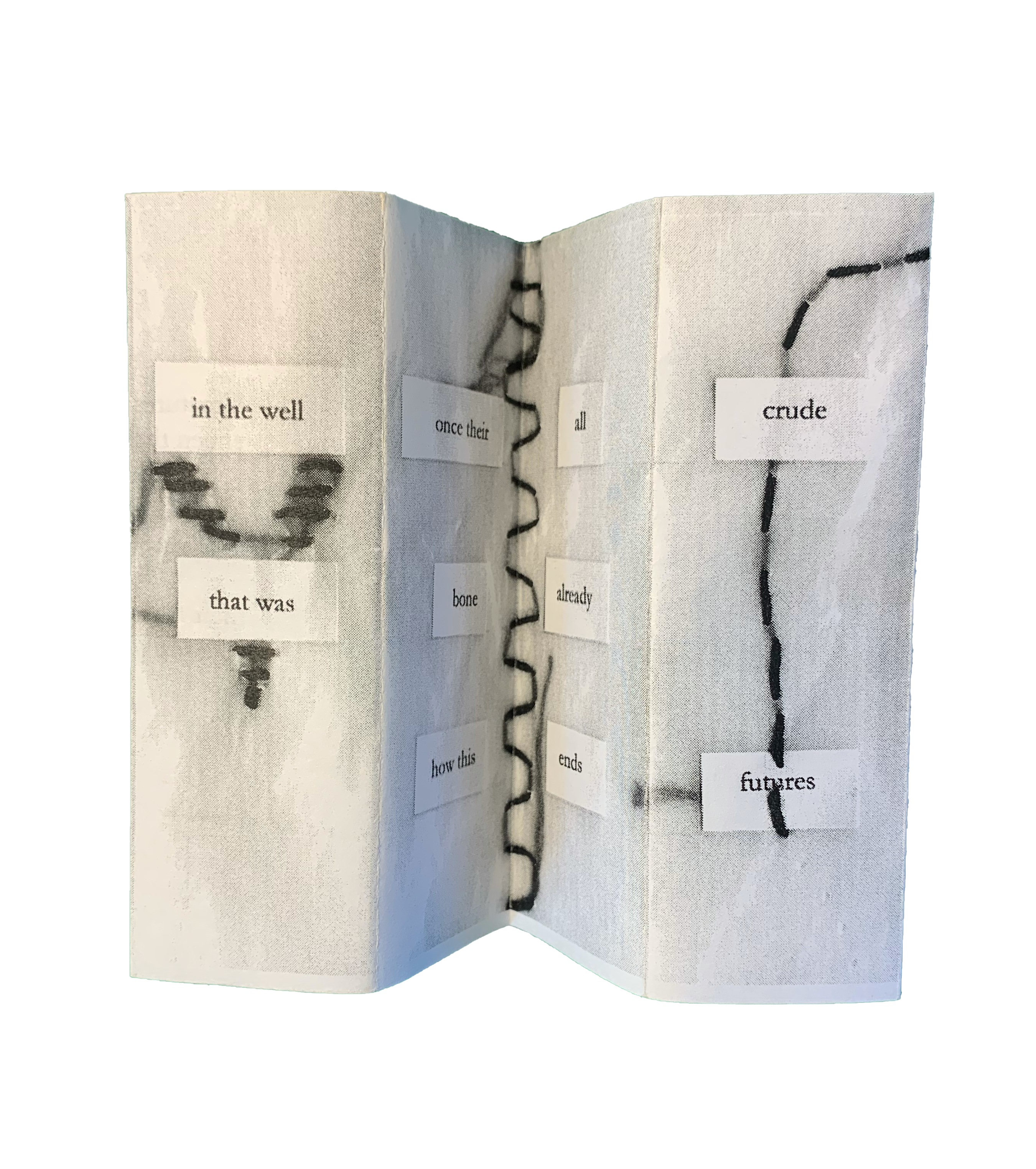 The two zine poems included here, “Crude Futures” and “After the Amplify Energy Oil Spill,” explore the fissures in our global oil economy. I made the former in April 2020 after crude oil futures reached a negative price for the first time in history. The pop-up structure of this zine allows the reader to create multiple versions of the poem—each future is slightly different from the last. I made the second zine in October 2021 after a pipeline operated by Amplify Energy spilled thousands of gallons of oil (the final quantity still pending) off the coast of California. This zine, which flips through a series of words linked by two letters, explores the relationship between different forms of life and the systems that shape their ability to live. A reversible zine, getting to the ‘end’ of the poem means entering the beginning of another. Because I wrote these poems while physically shaping their forms—writing and revising based on the constraints of paper, folds, reproducibility—I view the “flat” versions of these zine poems as entirely different poems, re-formed to match the constraints of traditional book publishing.